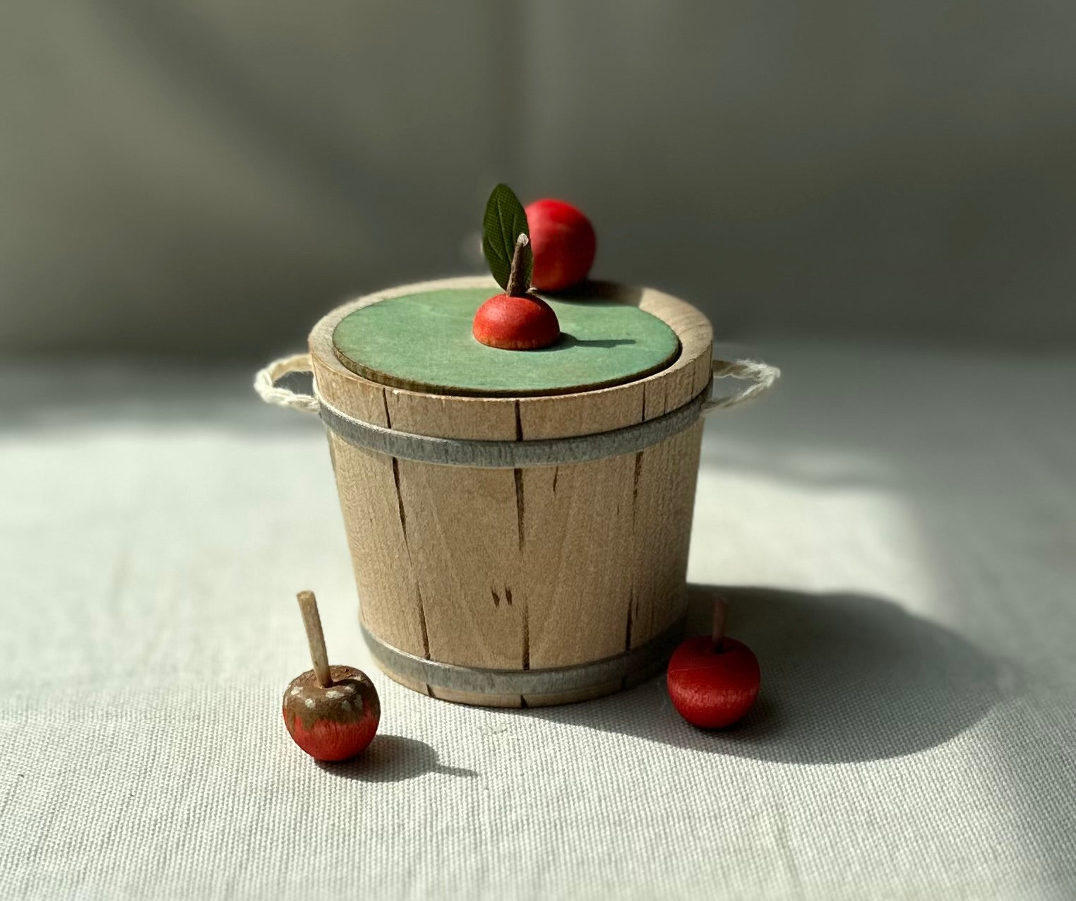 Apple bucket with one apple attached to the water/lid.